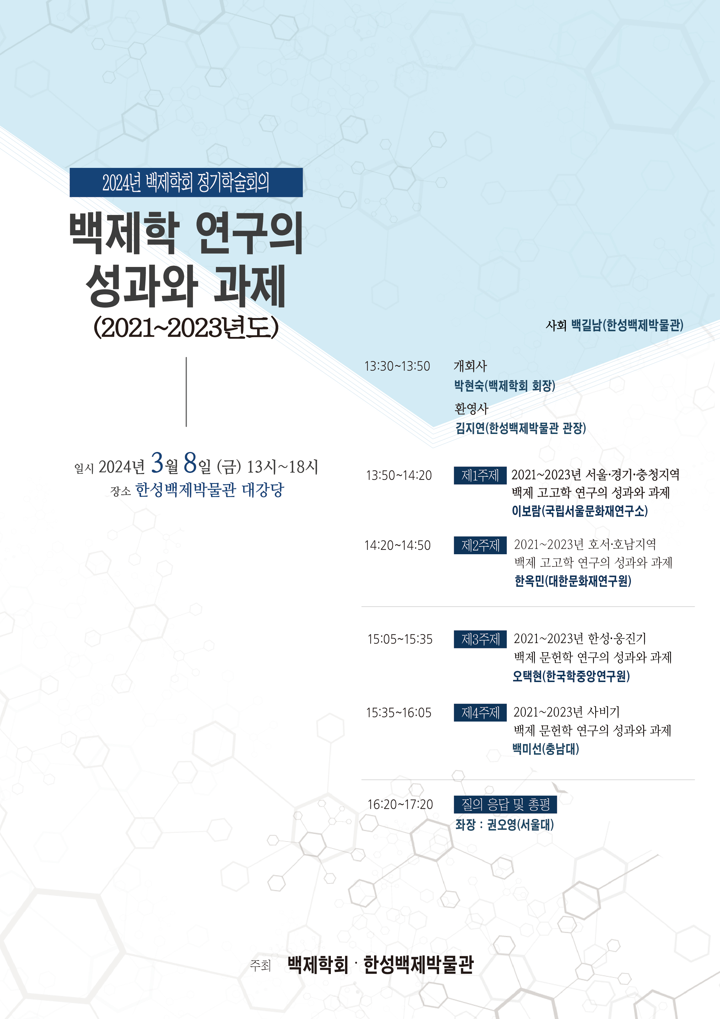 개회사 : 박현숙(백제학회 회장) 사회 : 백길남(한성백제박물관) 환영사 : 김지연(한성백제박물관장) |
