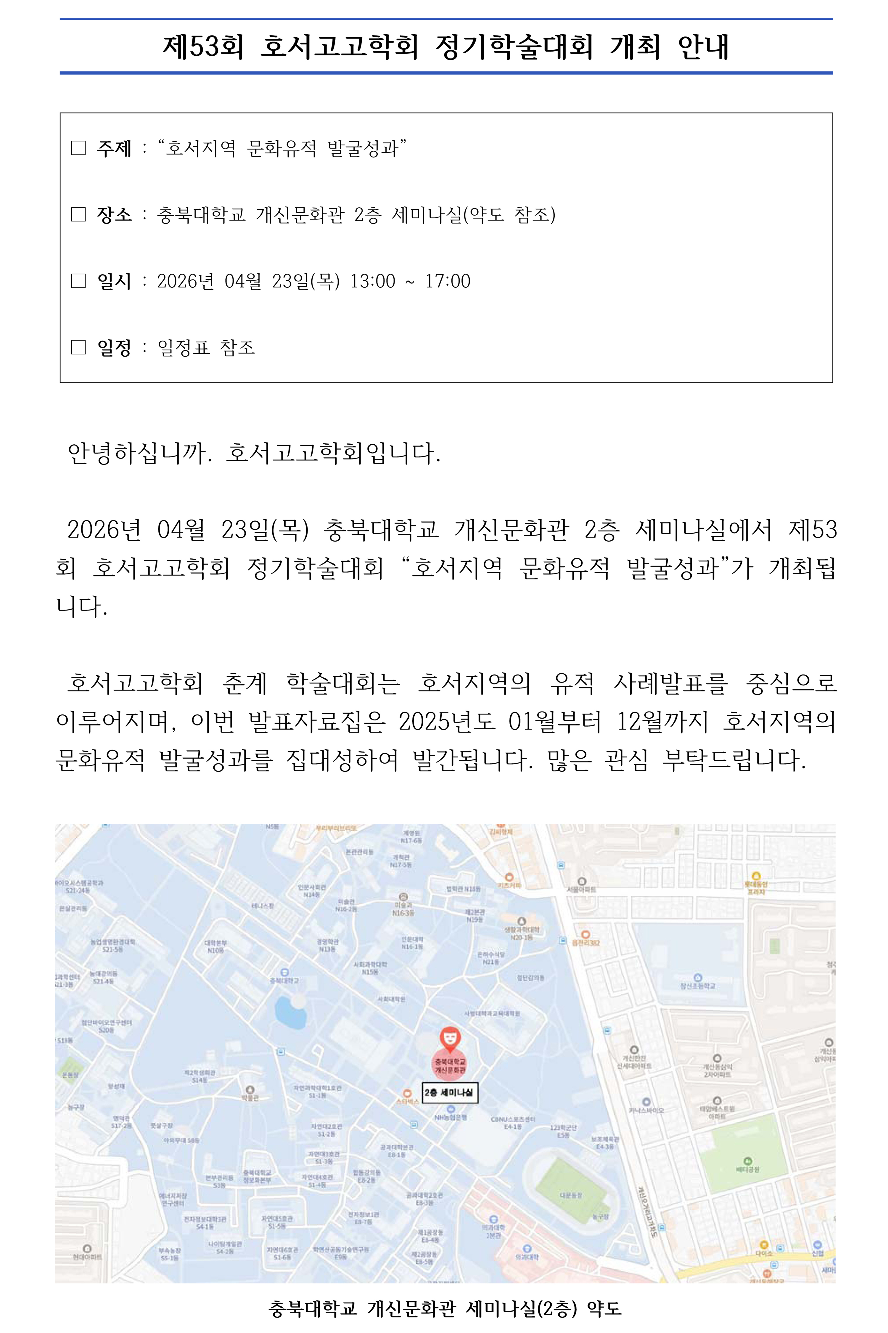 호서고고학회 제53회 정기학술대회(호서지역 문화유적 발굴성과)를 아래와 같이 개최하오니,