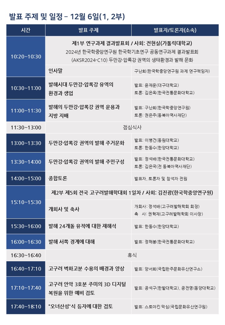 2024년 한국학중앙연구원 한국학기초연구 공동연구과제 결과발표회 (AKSR2024-C10) 두만강 압록강 권역의 생태환경과 발해 문화 | ||